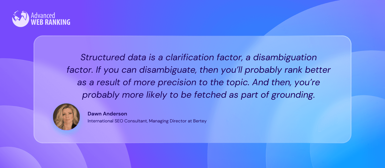 “Structured data is a clarification factor, a disambiguation factor. If you can disambiguate, then you’ll probably rank better as a result of more precision to the topic. And then, you’re probably more likely to be fetched as part of grounding.”