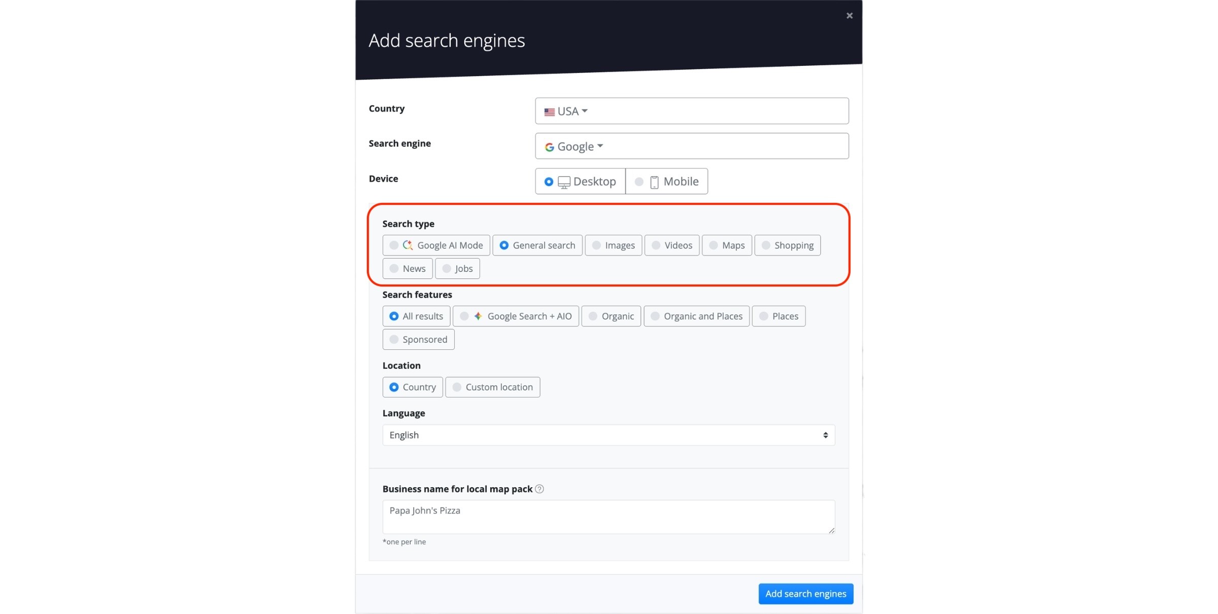 Search type – lets you set the Google search engine to track ranking positions from Google AI Mode results, the regular web search (General Search) or only on specific verticals such as Images, Videos, Maps, Shopping, News or Jobs.