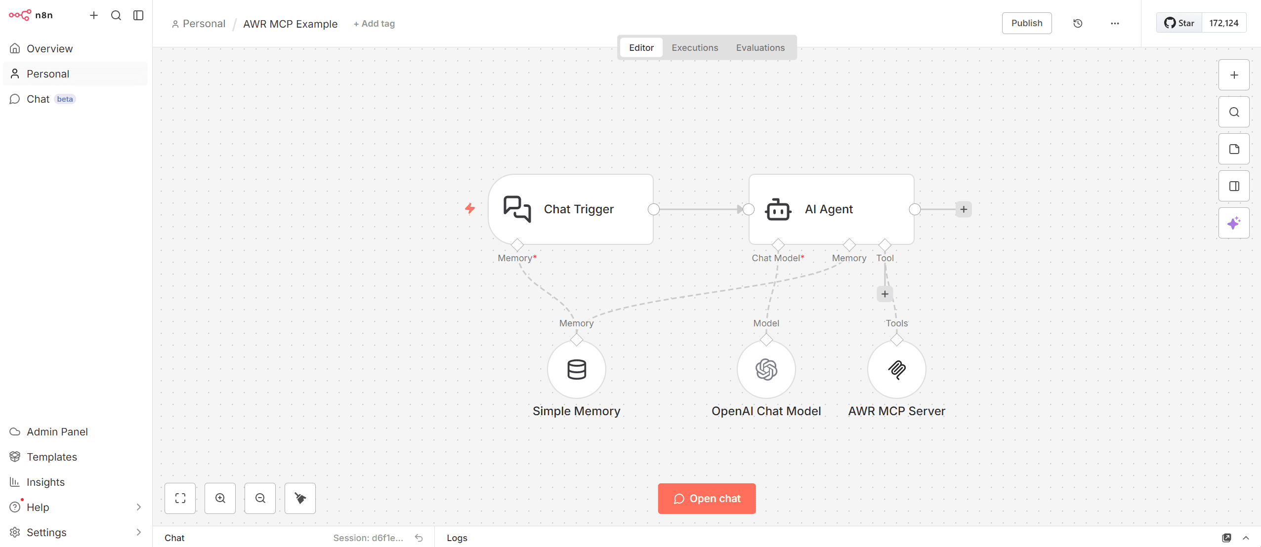 Once you closed all the popup windows and you are back in the n8n Editor, you can click on the “Open chat” button and start your conversation with the AI about your AWR data.