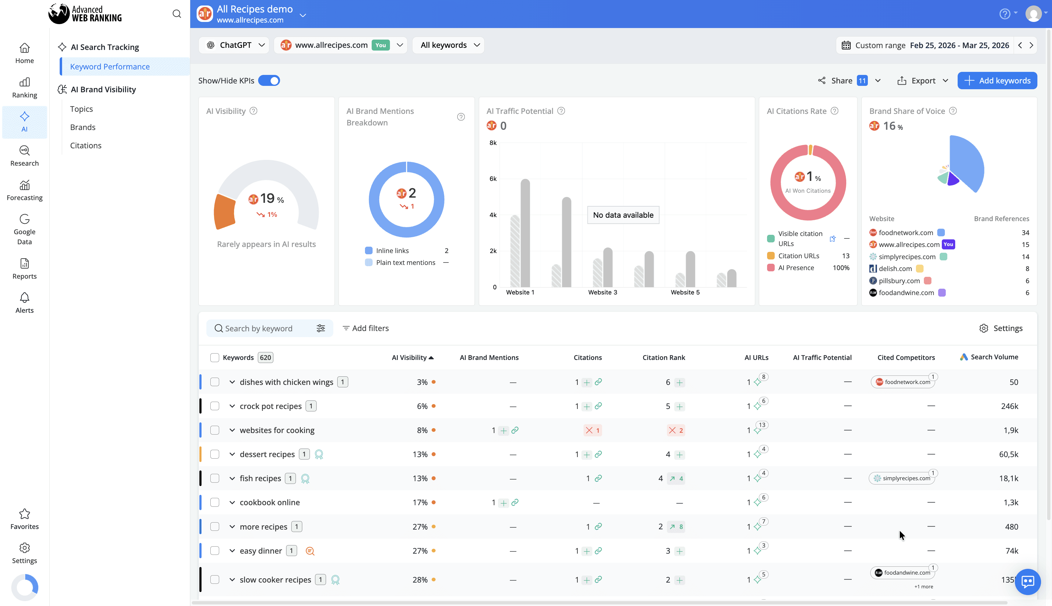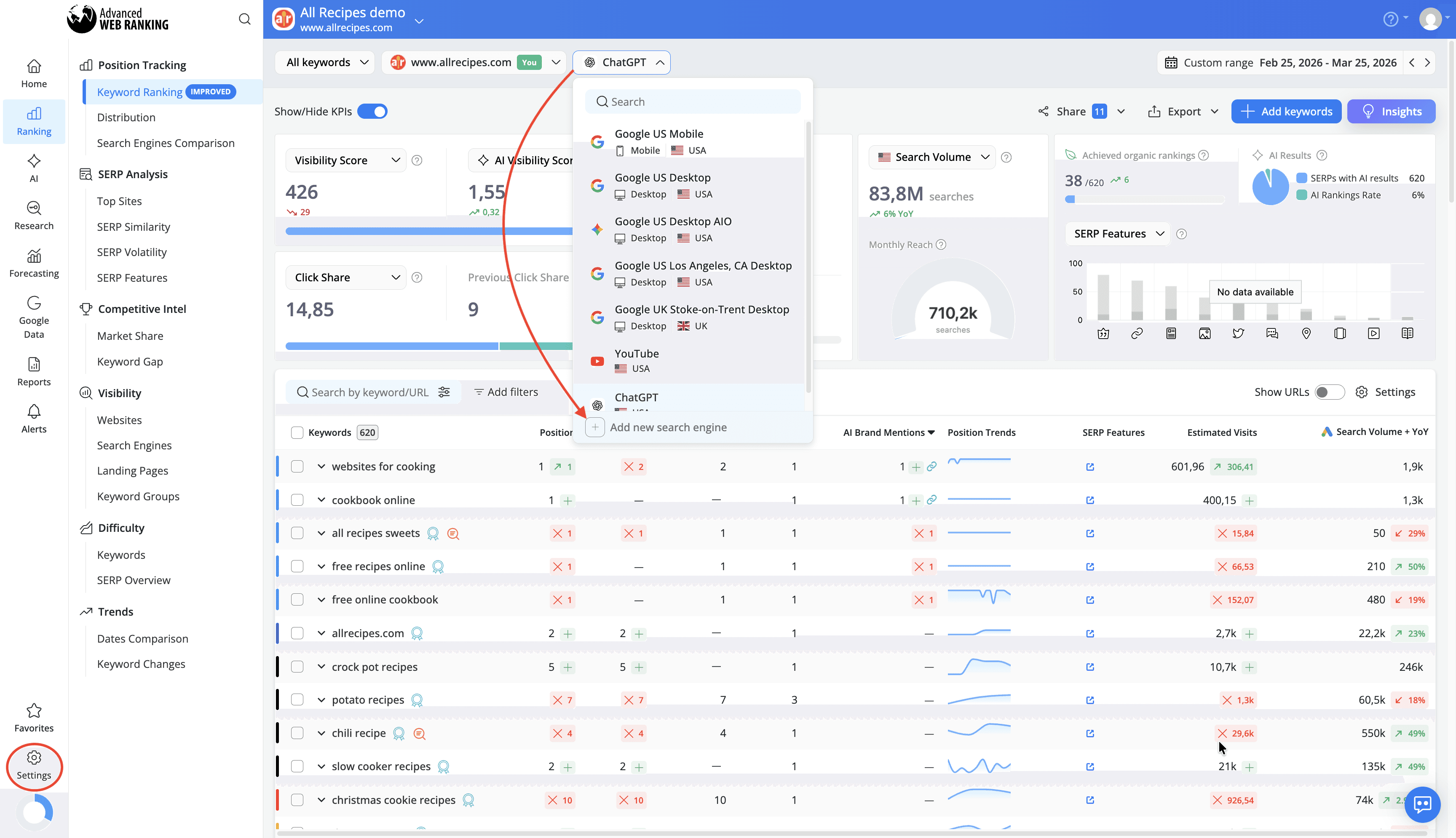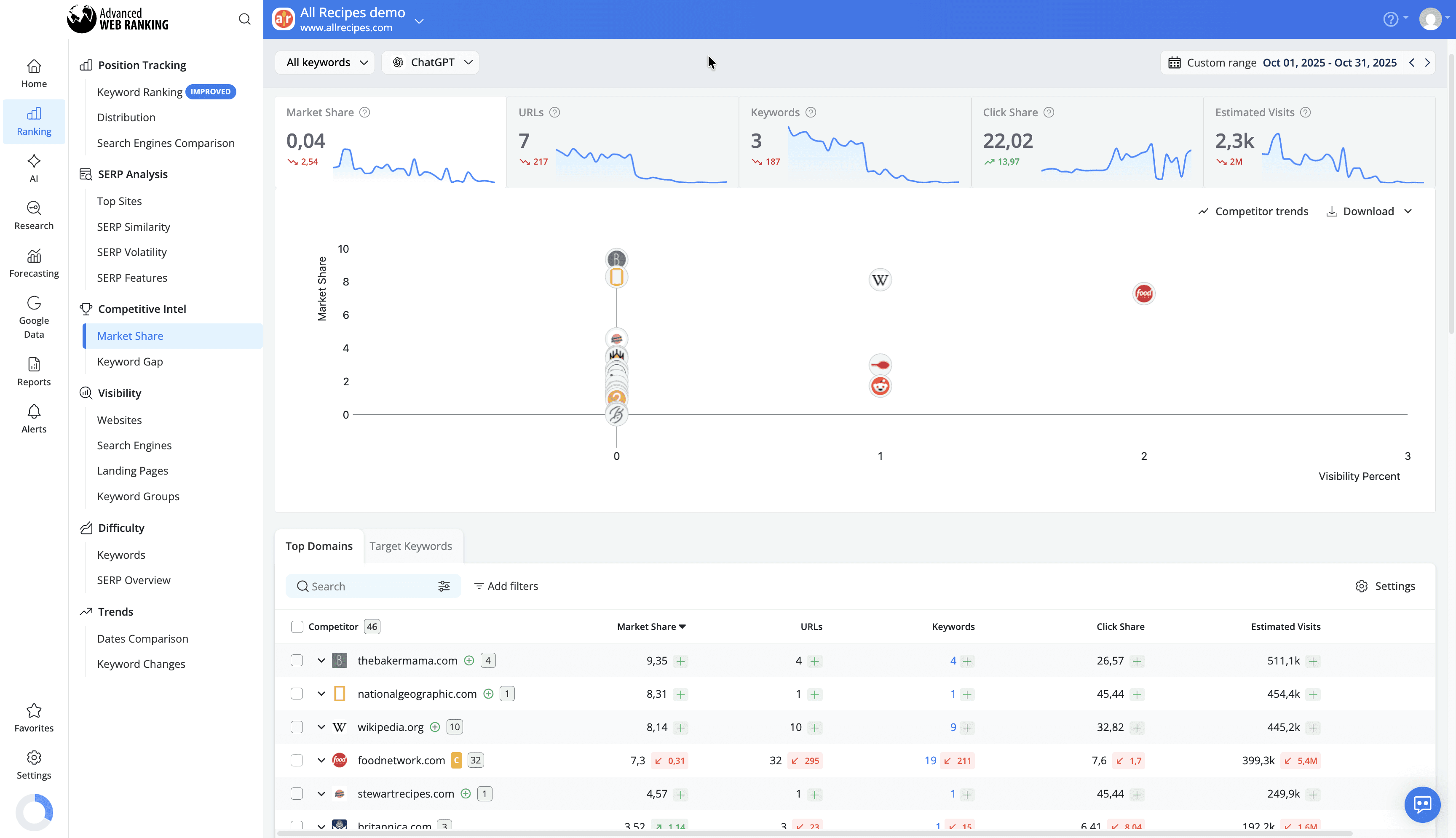 AWR tracks both ranking positions and visibility share, giving you a complete view of how your site performs within ChatGPT’s cited sources.
