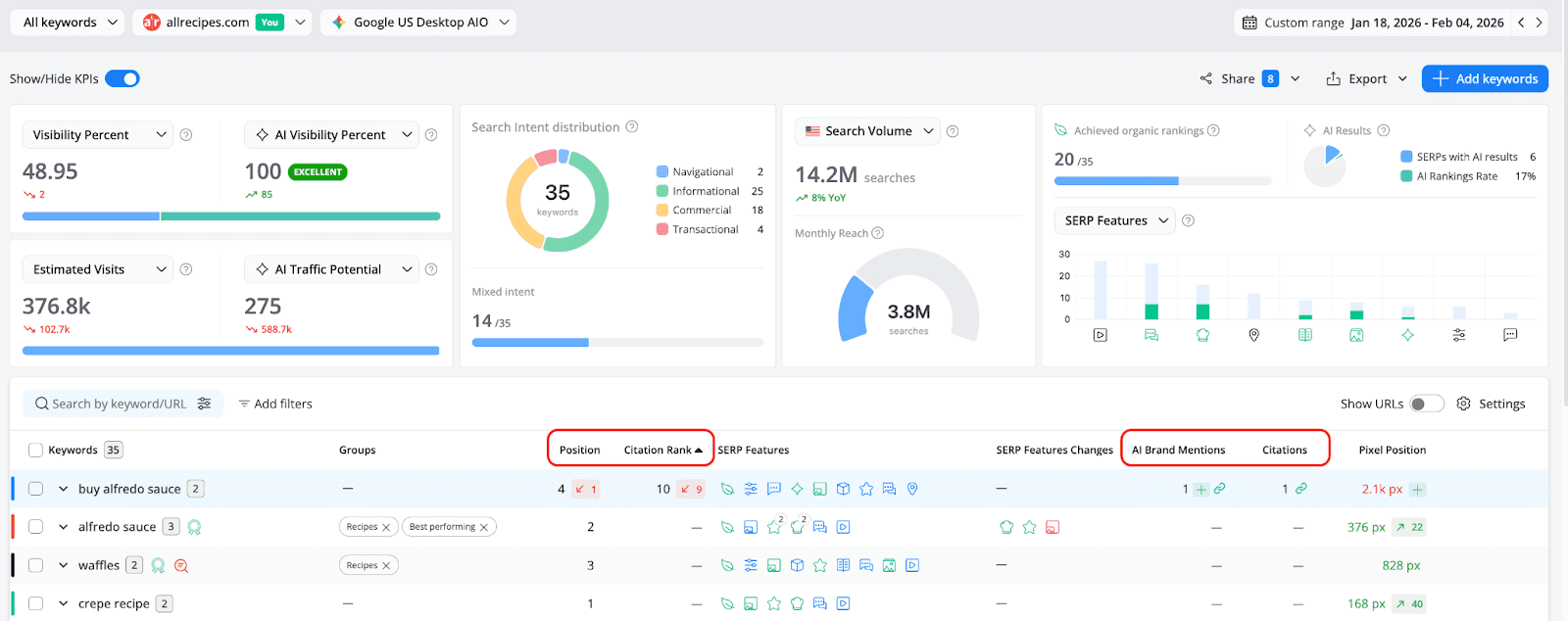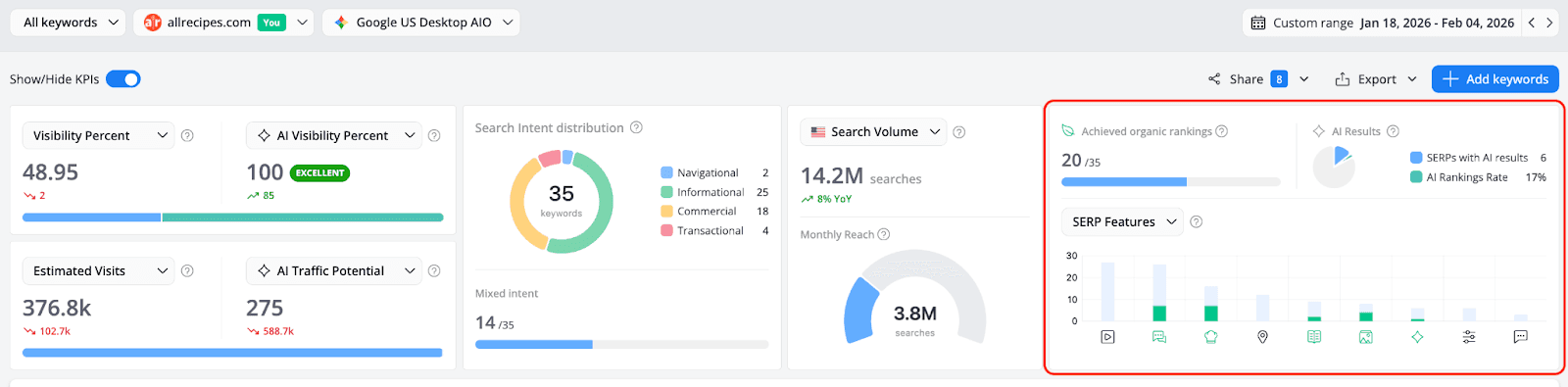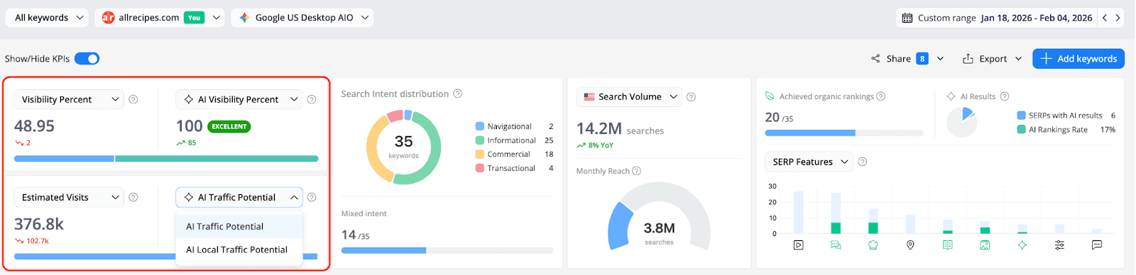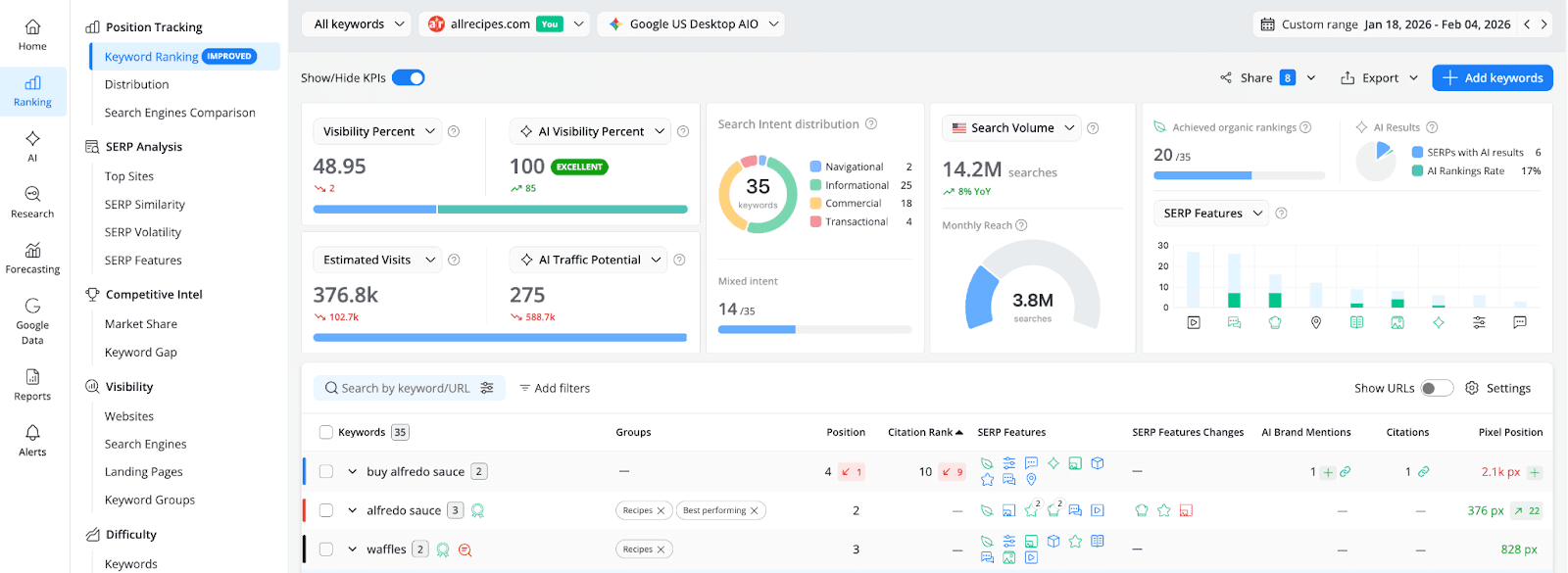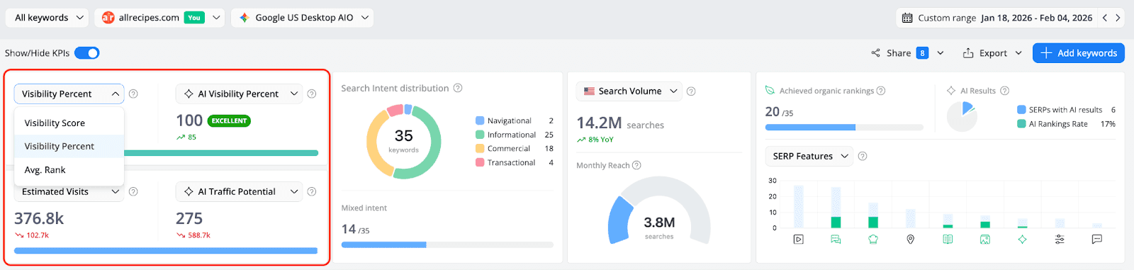 Search in 2026 runs on two parallel tracks. The Keyword Ranking report keeps you grounded in the traditional metrics that have always mattered - positions, SERP features, organic visibility. The AI Search Keyword Performance report adds the layer that's rapidly becoming just as important: how AI models see your brand, what they cite, and how often users encounter you through AI-generated answers rather than through a list of blue links.