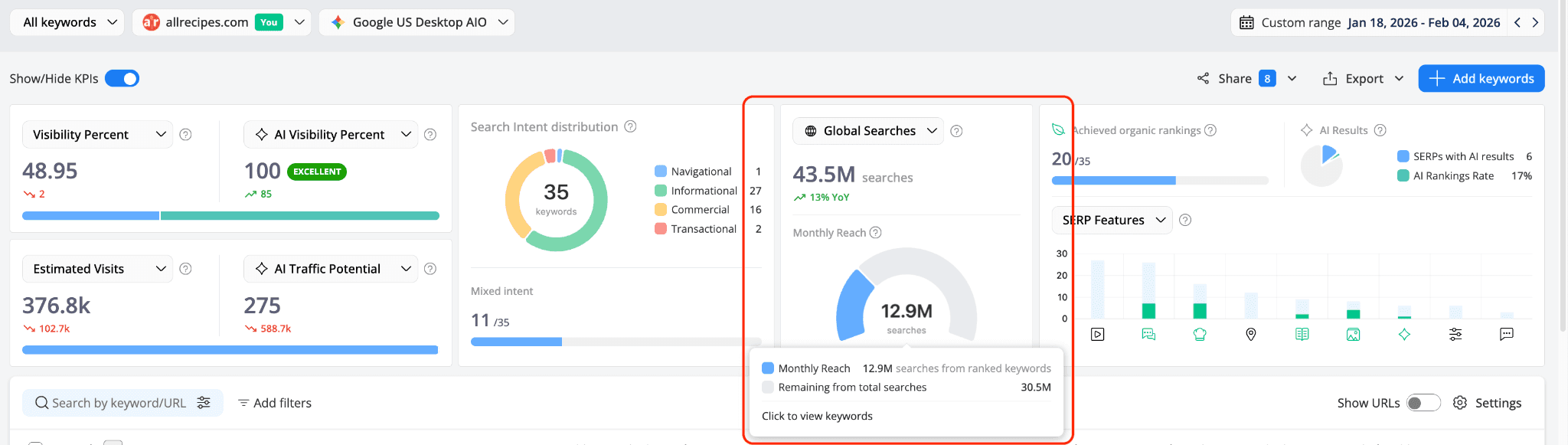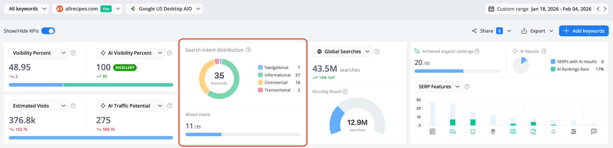 These indicators help you understand the search demand and main goal behind the keywords you track, including their intent, search volume, and the potential audience size.