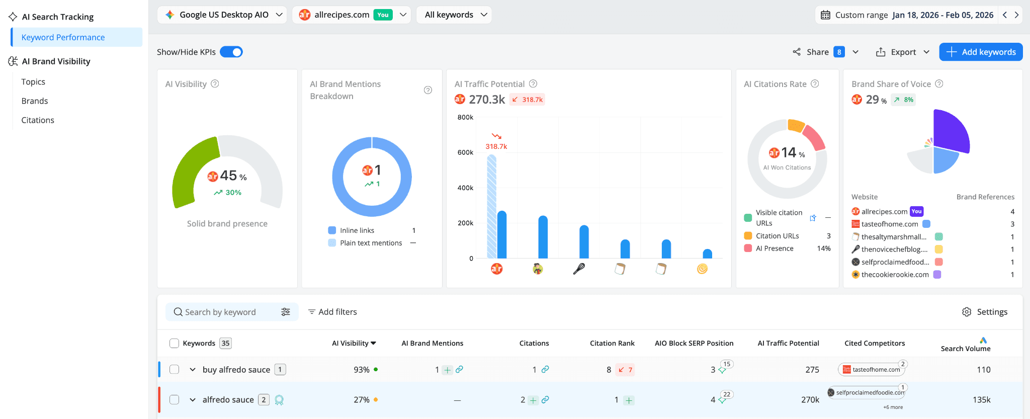 AI Search Keyword Performance shows how visible you are in AI generated search answers.
