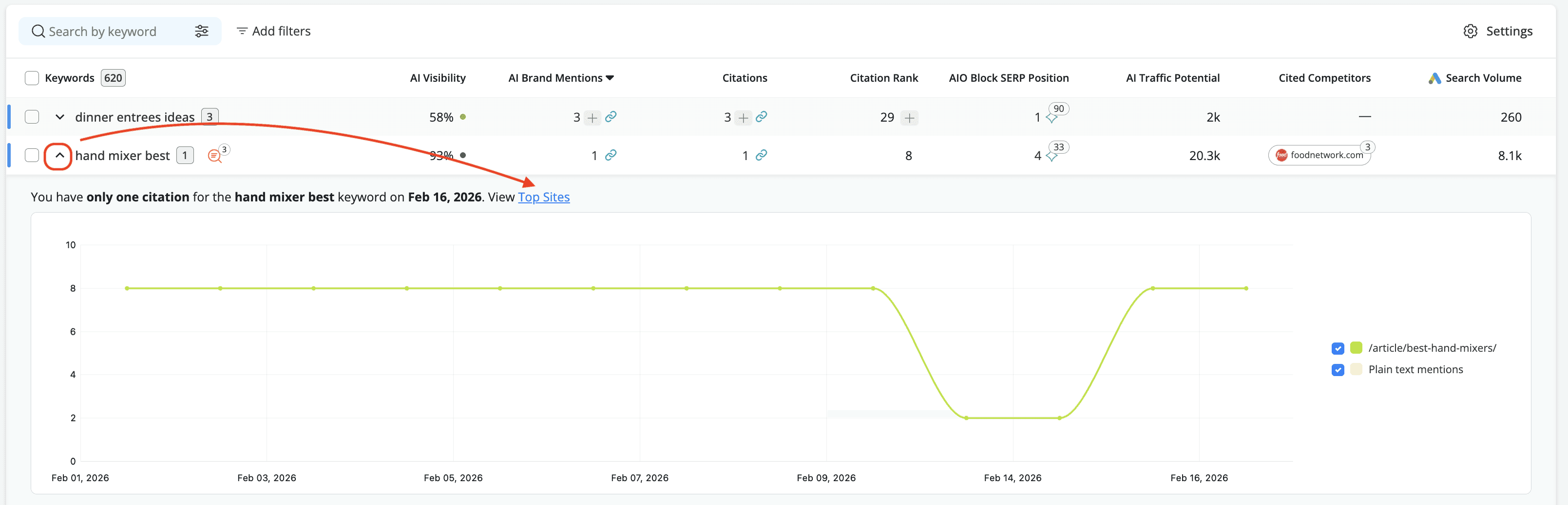 Move to AI Keyword Performance for AI-specific strategy. Once you know which keywords are triggering AI results, this report tells you whether your brand is benefiting from them. Filter by AI Visibility to surface your strongest and weakest performing AI keywords. Use the expand chart on any keyword row to see how your citation rank and mentions have trended over time.