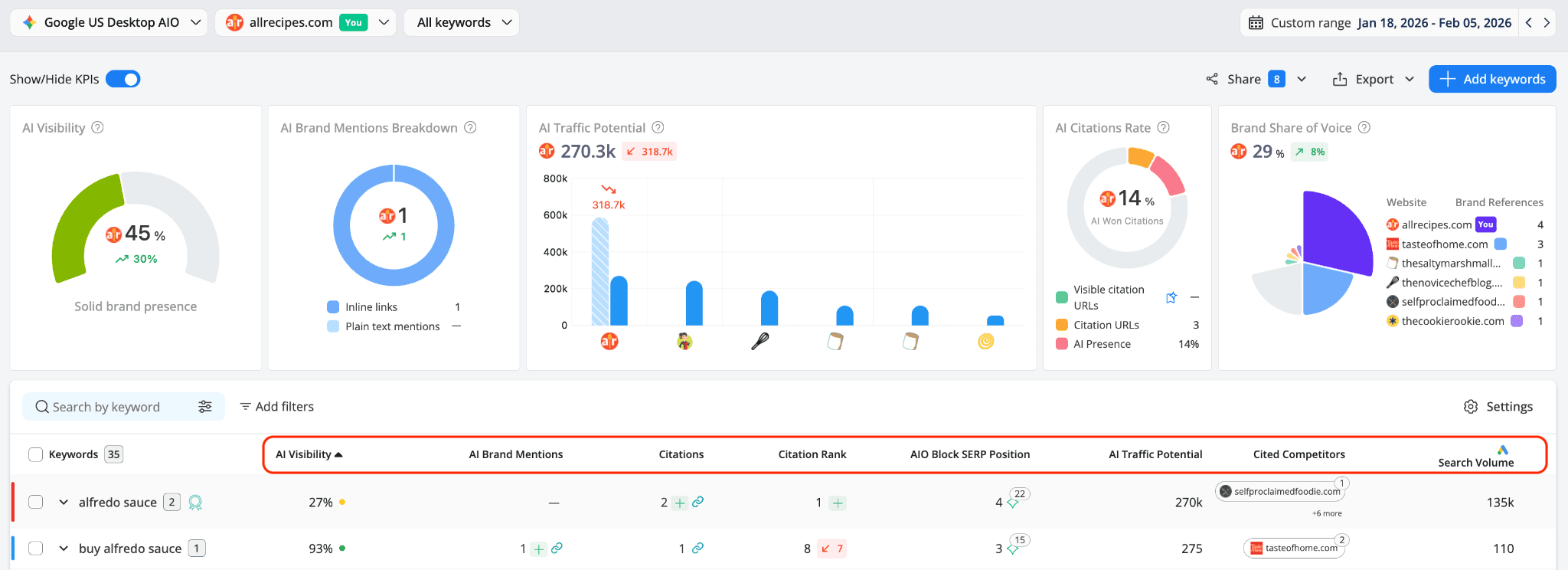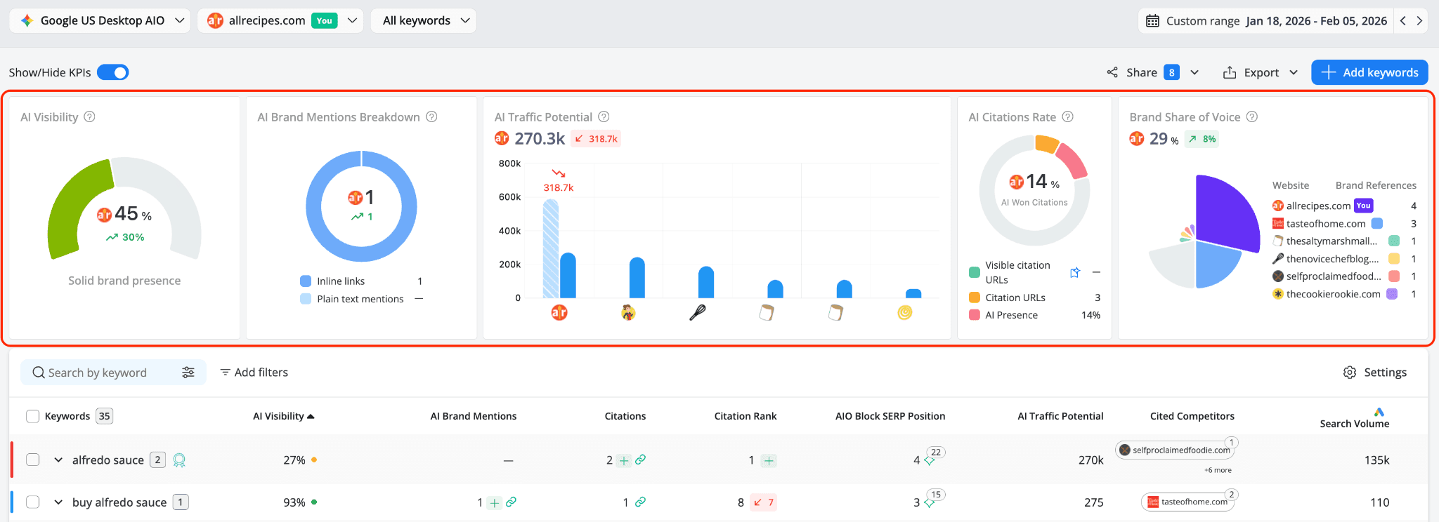 These metrics show where your website appears for each keyword and how often your brand appears inside AI-generated results.