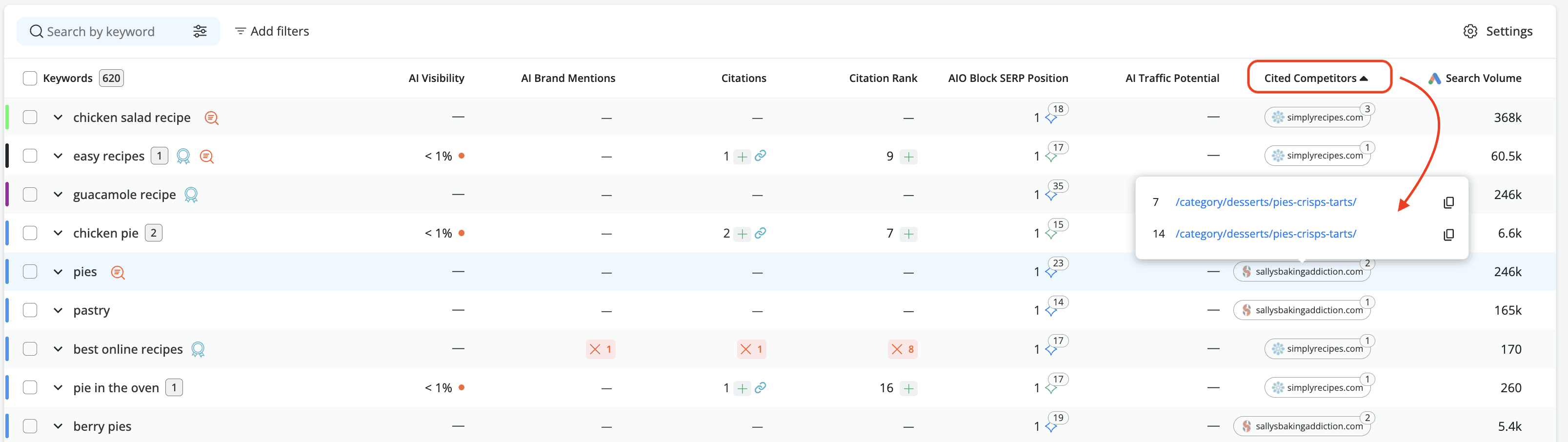Cited Competitors - which tracked competitor domains are also cited in the same AI responses generated by your tracked keywords.