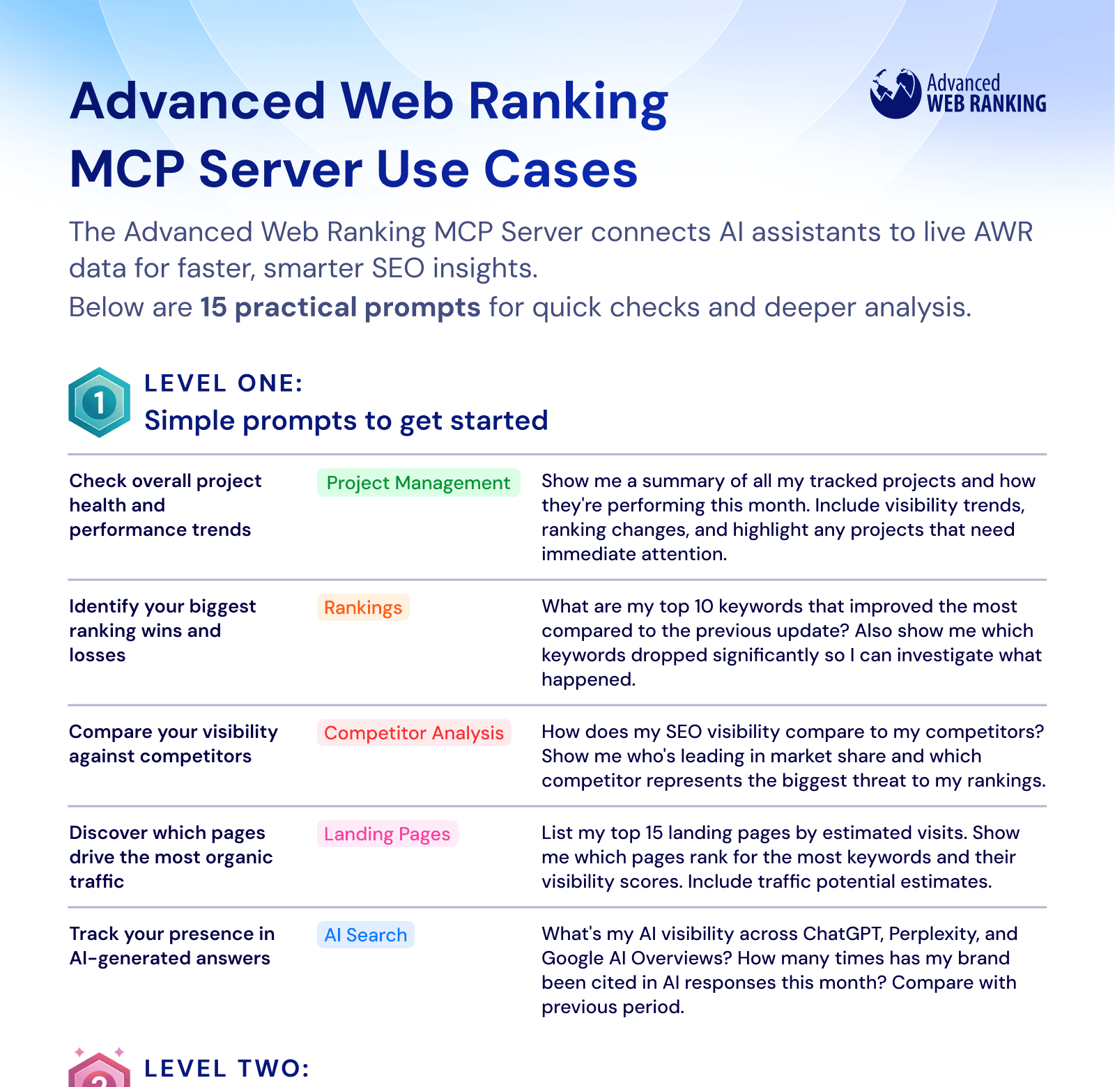 With Advanced Web Ranking MCP, you can pull AWR data through your AI agents and speed up decision-making. For example: