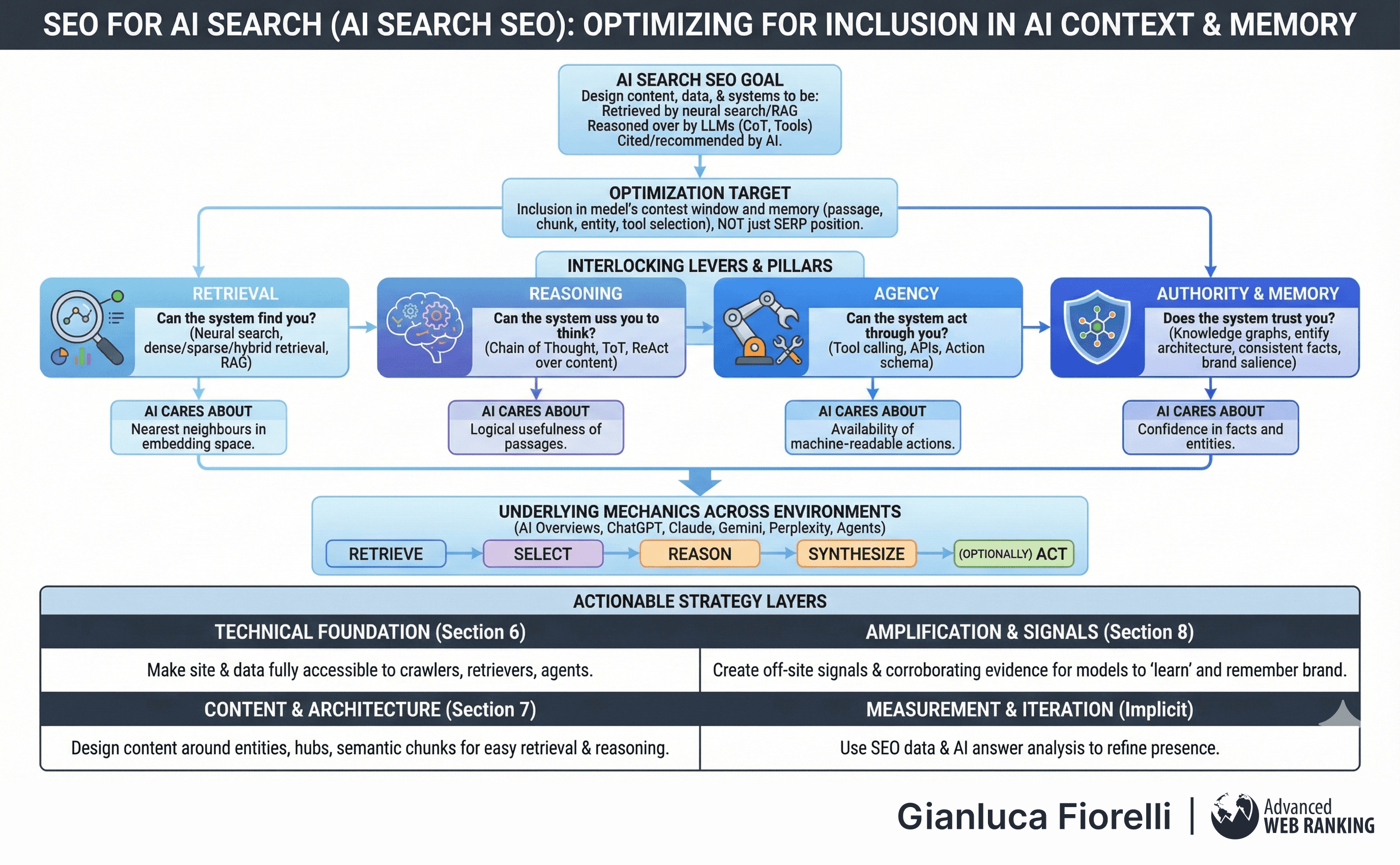 Instead of optimising only for “position in a SERP,” AI Search SEO optimises for inclusion in the model’s context window and memory: being the passage, chunk, entity, or tool that the system chooses when it constructs an answer or executes a task.