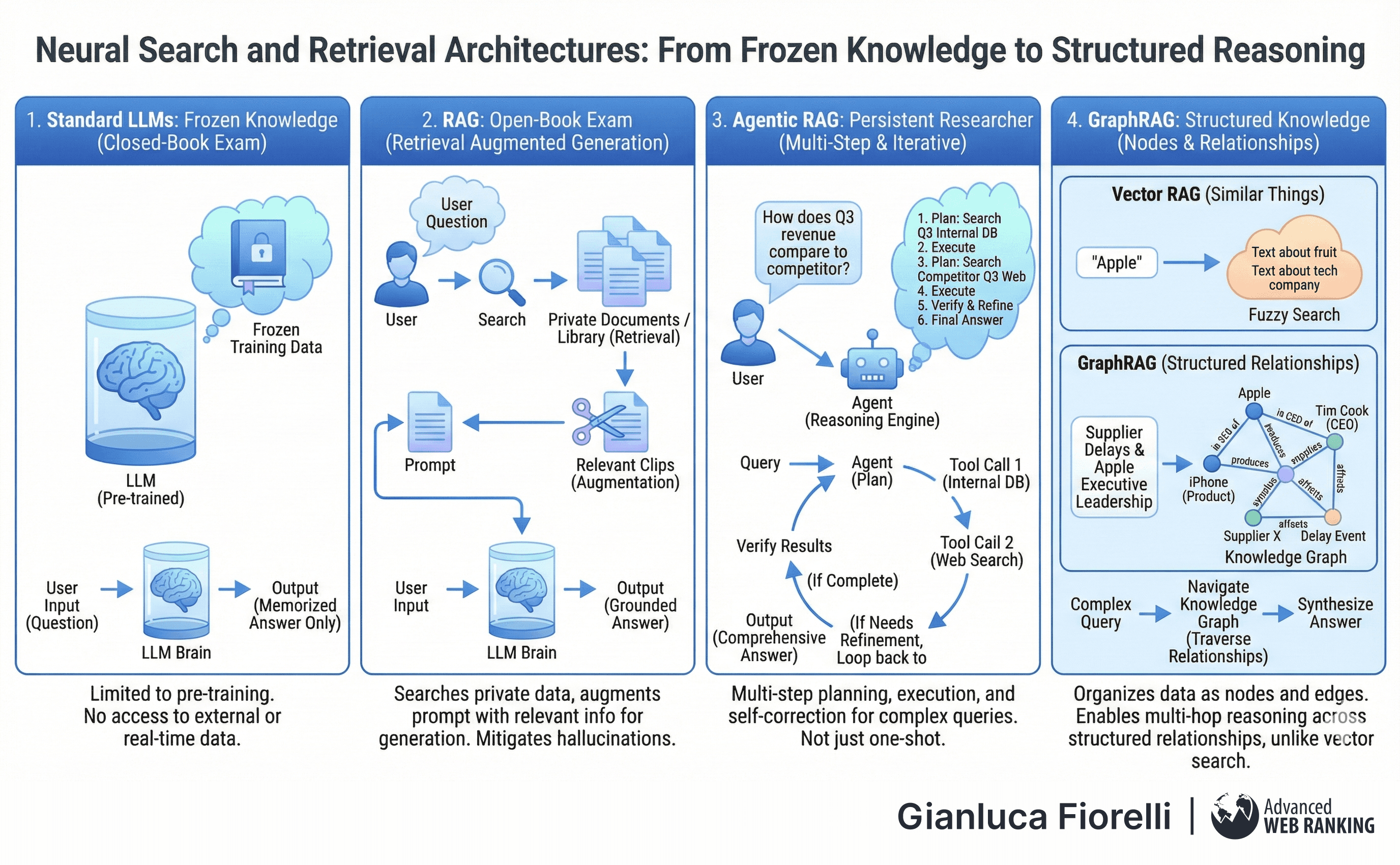 LLMs have frozen training data; to be useful in an enterprise, they must access private, real-time data. This is the domain of Retrieval Augmented Generation (RAG) and Neural Search.