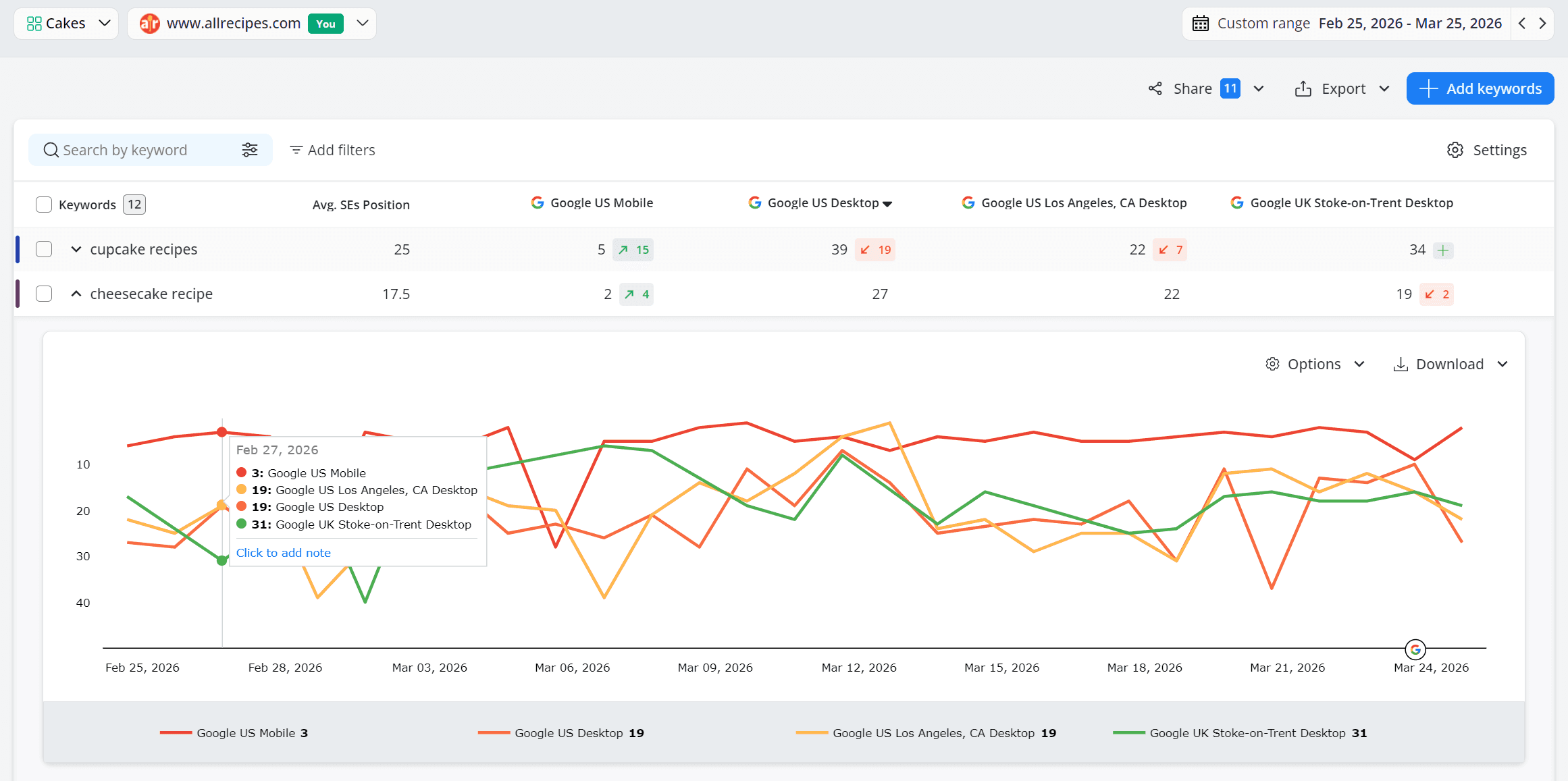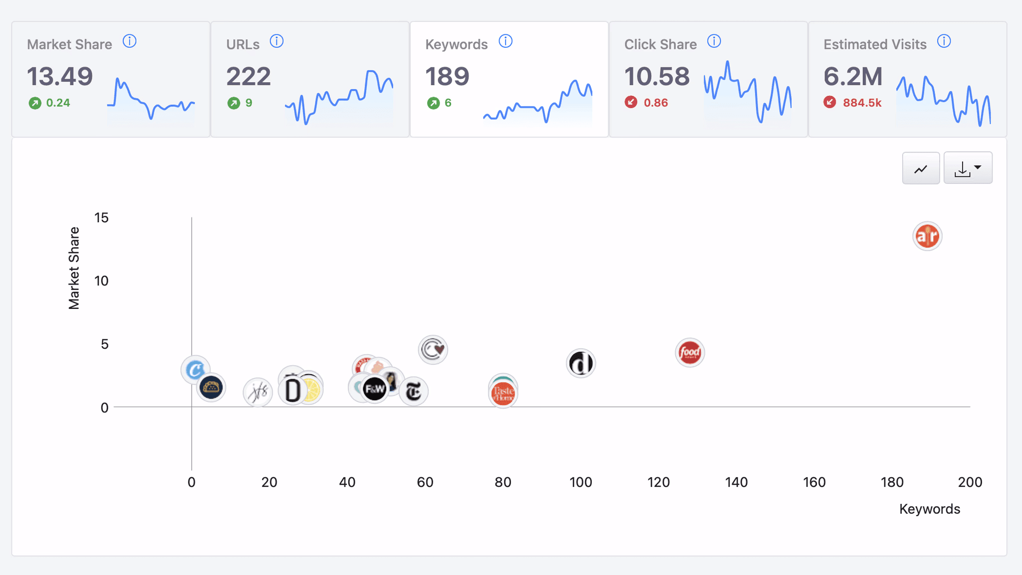 Track up to 50 competitors per project at no additional cost. See their keyword rankings, visibility trends, market share, SERP feature wins, and AI search presence — side by side with your own data.