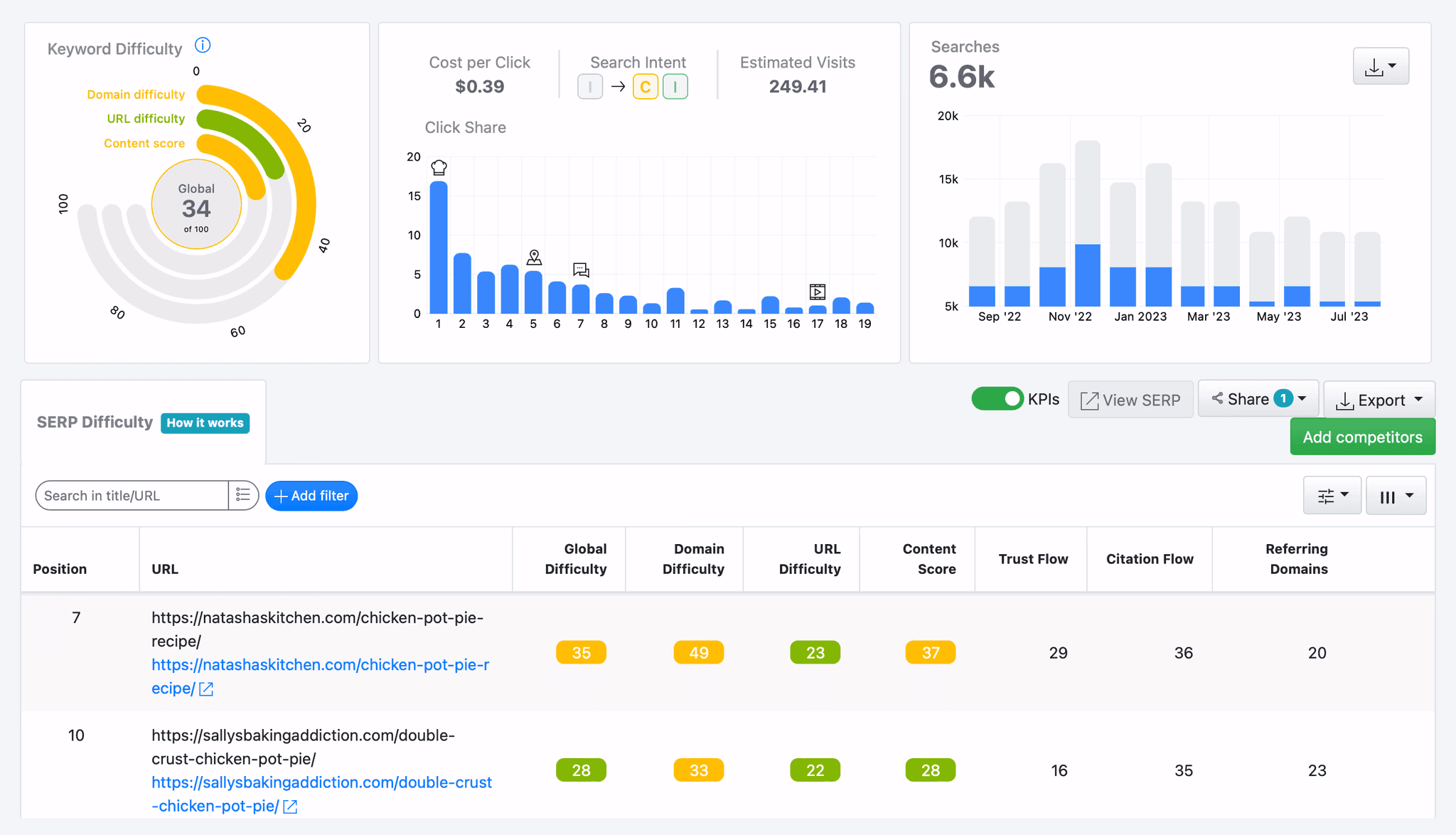 Every keyword comes with the context you need to act: search intent classification, granular difficulty scores (URL, Domain, and Content level), click share estimates, and SERP feature tracking. Filter by cannibalization to catch pages competing against each other, or group keywords dynamically to manage tracking at scale.