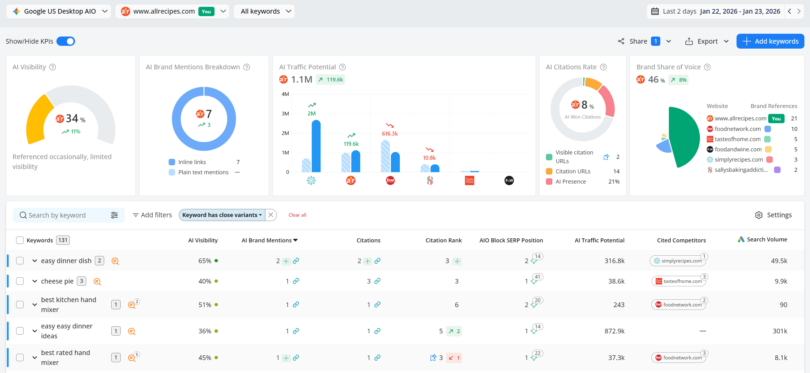 Measure what matters with dedicated AI search metrics: AI Visibility to gauge your overall presence, Citations and Brand Mentions to see when and where AI references your content, and AI Traffic Potential to estimate the real opportunity behind AI-generated results.