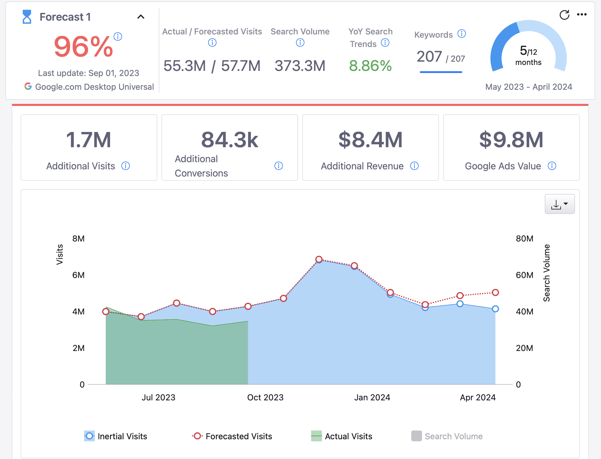 Pitch new clients or retain existing clients with Forecasts of the organic visits, conversions, and revenue.